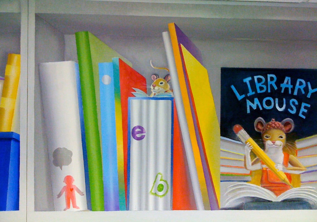 A supersized bookshelf mural where stories come alive and characters peek out to play.