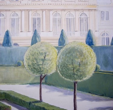 "Lollipop" Topiary gardens painted with softness and charm—a child-friendly glimpse into the royal grounds