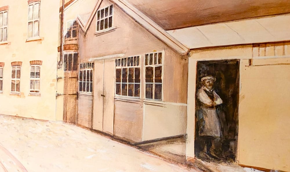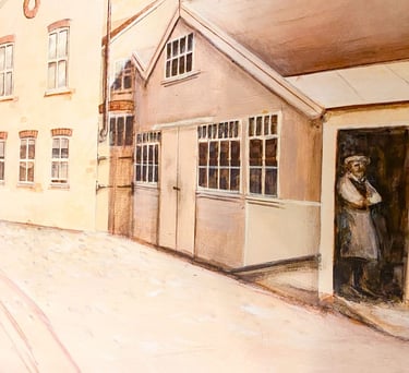 The pub sign shown is a brewery sign. It was commissioned not to entice visitors for a chat and a pint, but to celebrate the heritage of the converted Old Coach House on the former brewery's site. The images are based on old photographs taken at this location in Cambridgeshire.