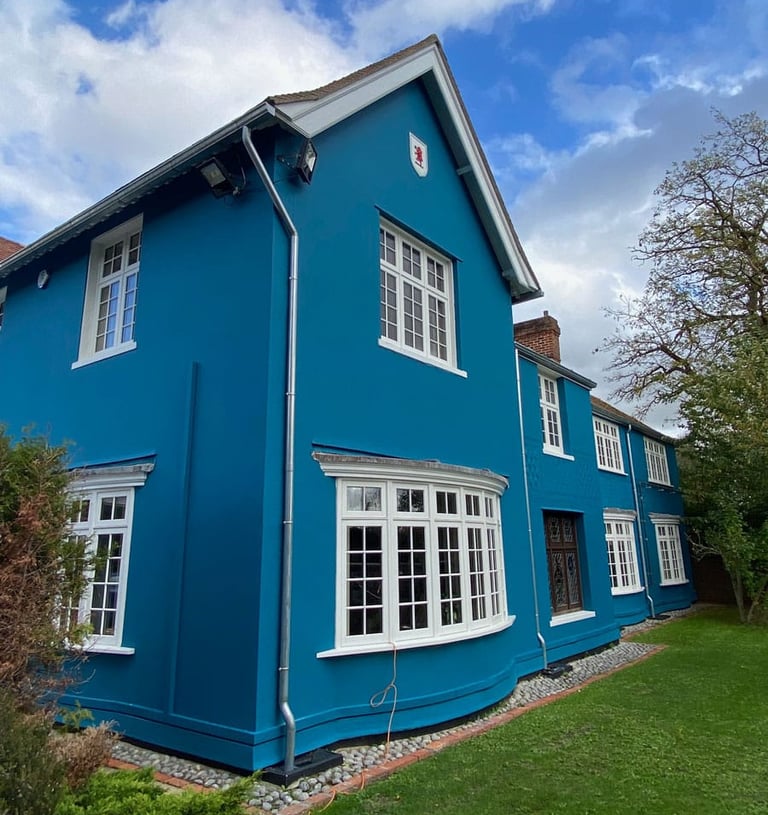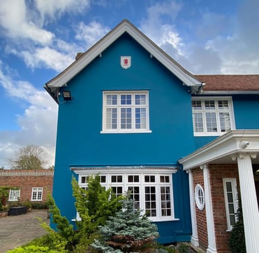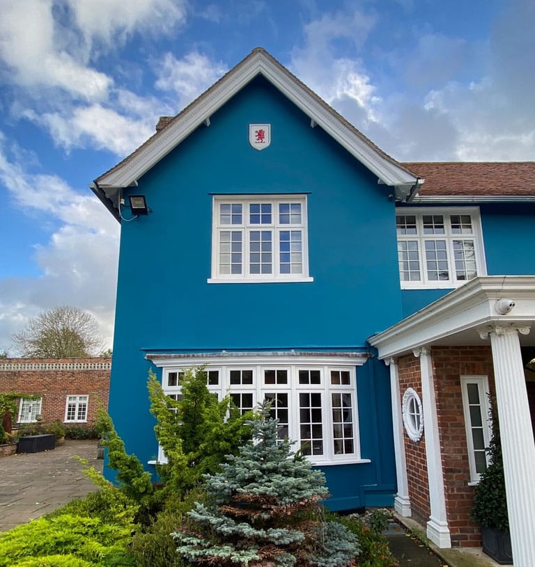A trompe-l’oeil crest in bold red and white brings a quiet grandeur to a Tudor villa façade—an homage to heritage, illusion, and carefully cast light.